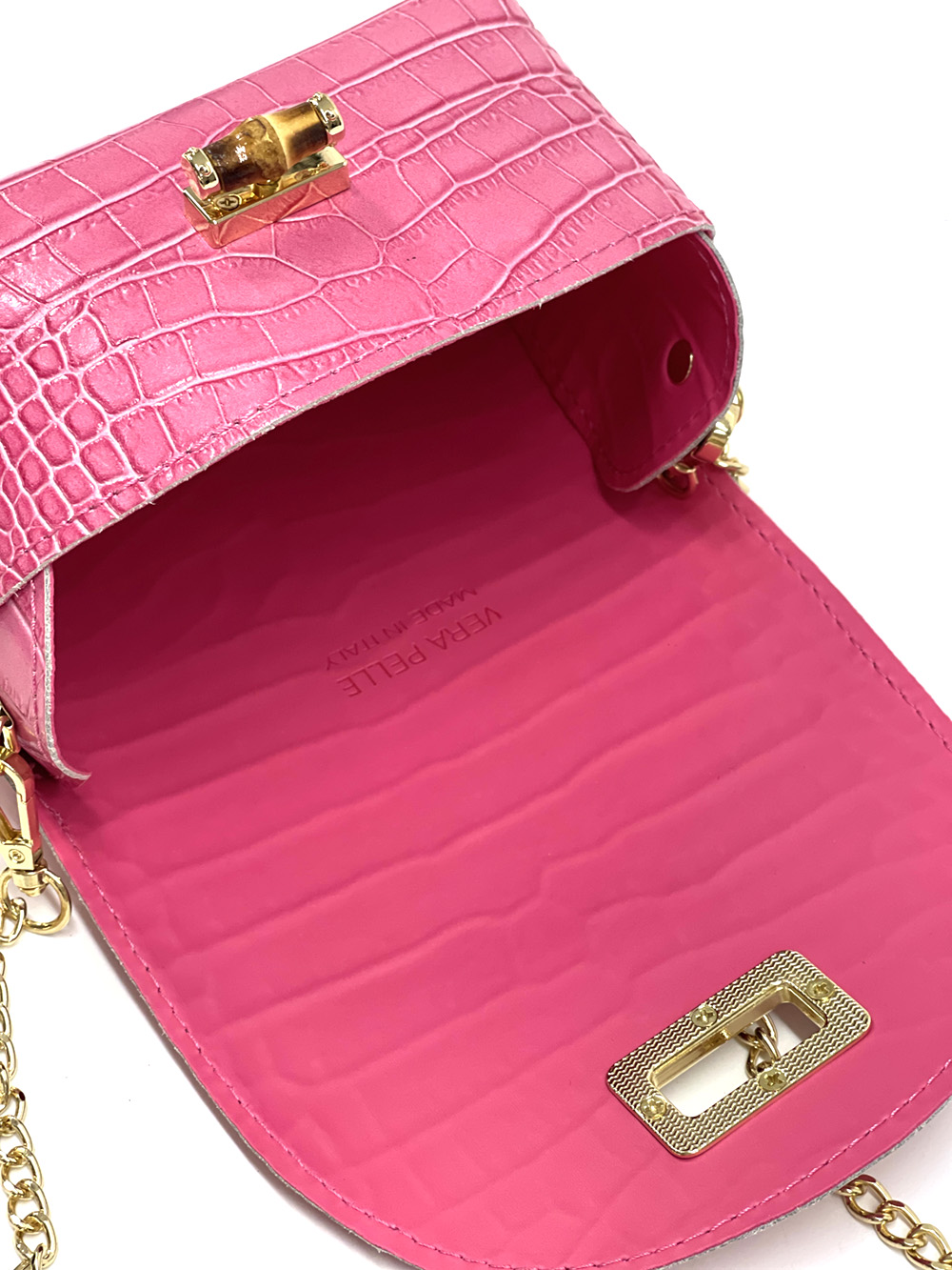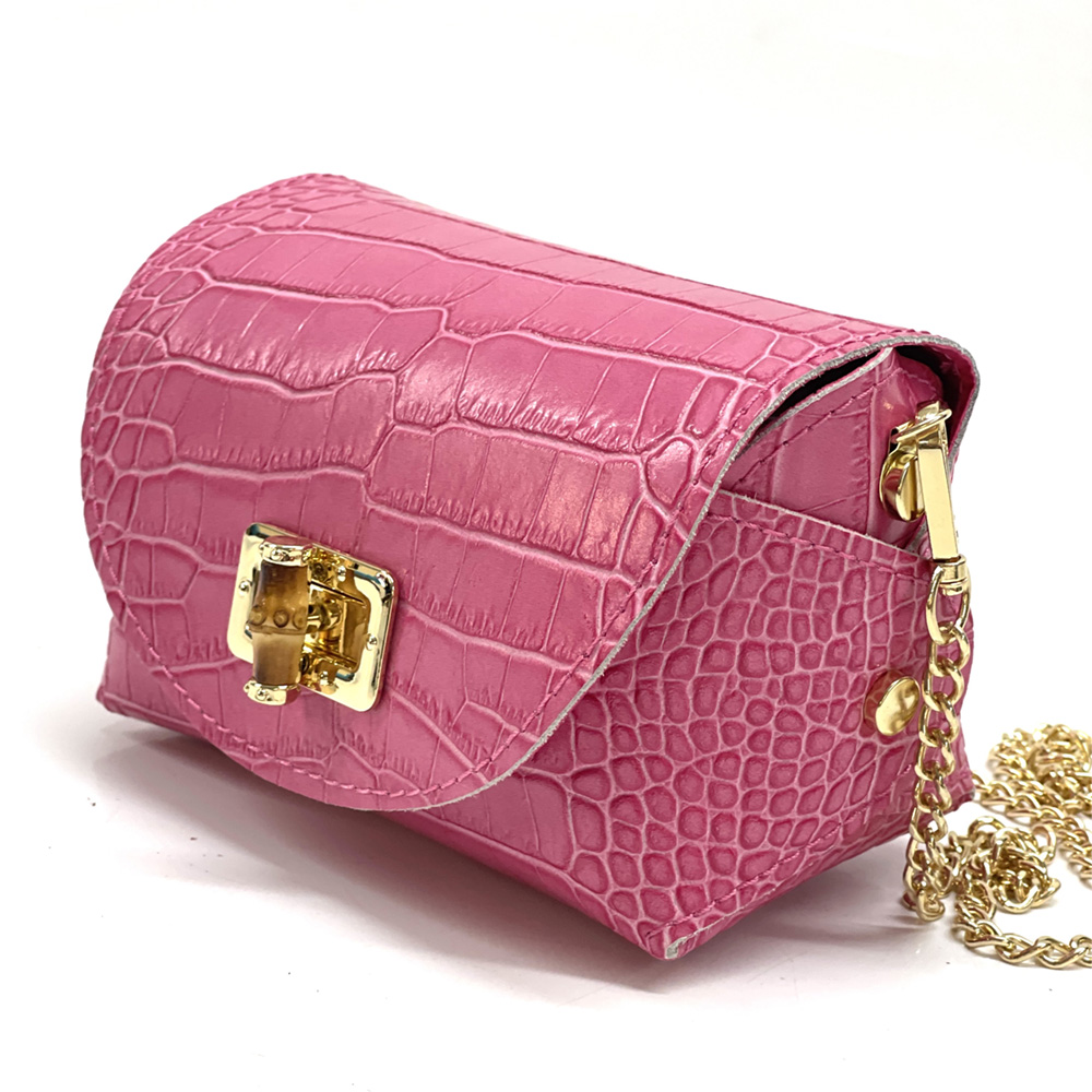 Le Martina S est un petit sac bandoulière en cuir qui allie élégance italienne et praticité moderne. Conçu en cuir de veau véritable avec une finition embossée effet croco, il incarne l’artisanat toscan dans un format compact, parfait pour un usage quotidien ou pour les sorties en soirée. Sa fermeture métallique dorée à twist et sa bandoulière chaîne amovible et réglable permettent de le porter de différentes manières – en travers, à l’épaule ou même à la main.