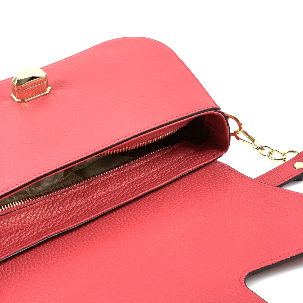 Sa silhouette compacte est accentuée par un rabat ondulé qui se ferme avec un fermoir tourniquet doré, sécurisé par une fermeture zippée à l’intérieur. Le sac dispose d’une bandoulière réglable pour un porté épaule ou croisé, ainsi que d’une poignée en cuir souple pour un porté main élégant. Une chaîne dorée latérale ajoute une touche de sophistication.